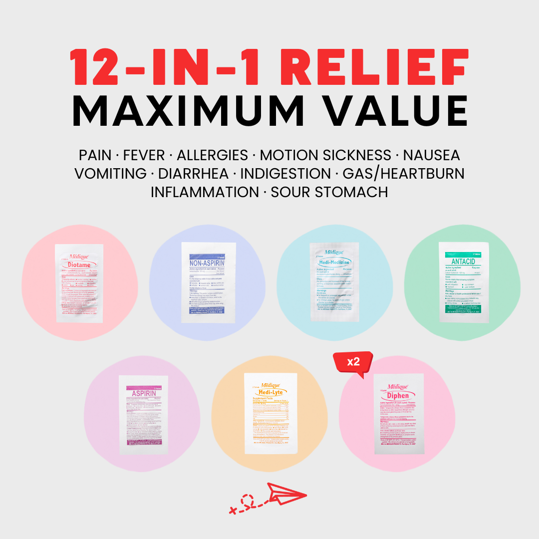 - 2 x Diphen (Diphenhydramine 25mg) - Alleviate allergies, nausea, and aid in sleep.